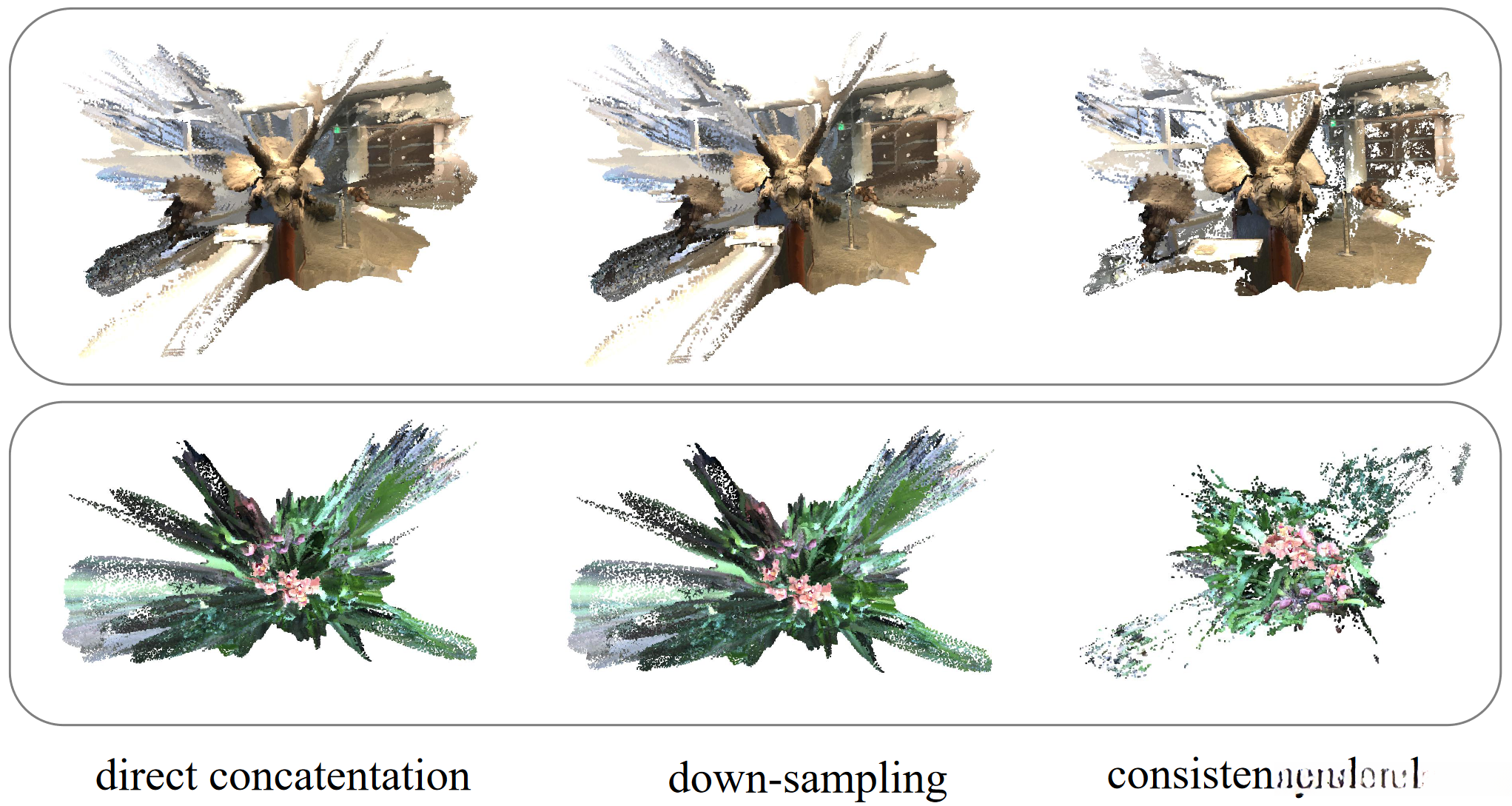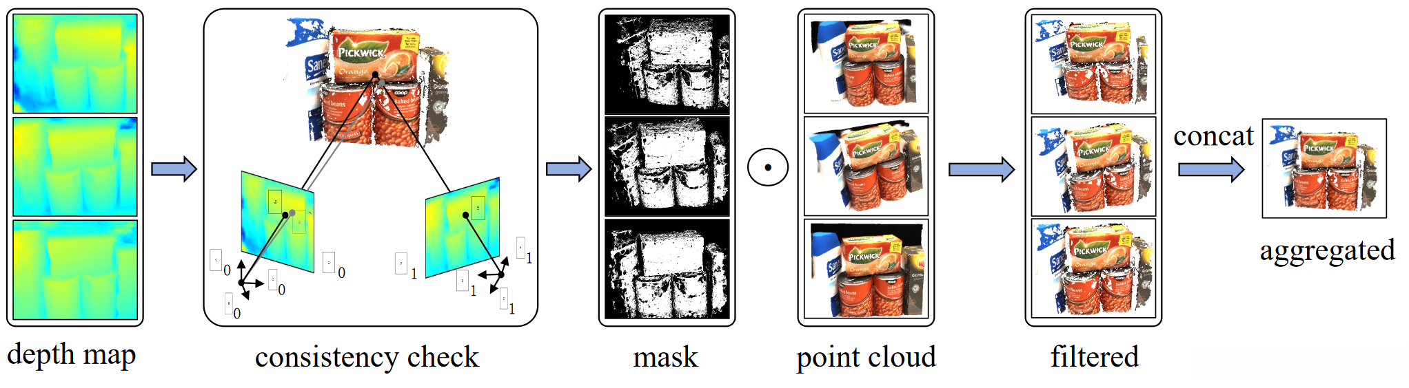Consistent aggregation. With depth maps and point clouds produced by the generalizable model, we first conduct geometric consistency checks on depths to derive masks for filtering out unreliable points. The****_filtered point clouds _are then concatenated to obtain a point cloud, serving as theinitialization for per-scene optimization.