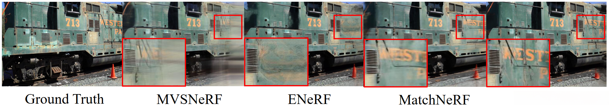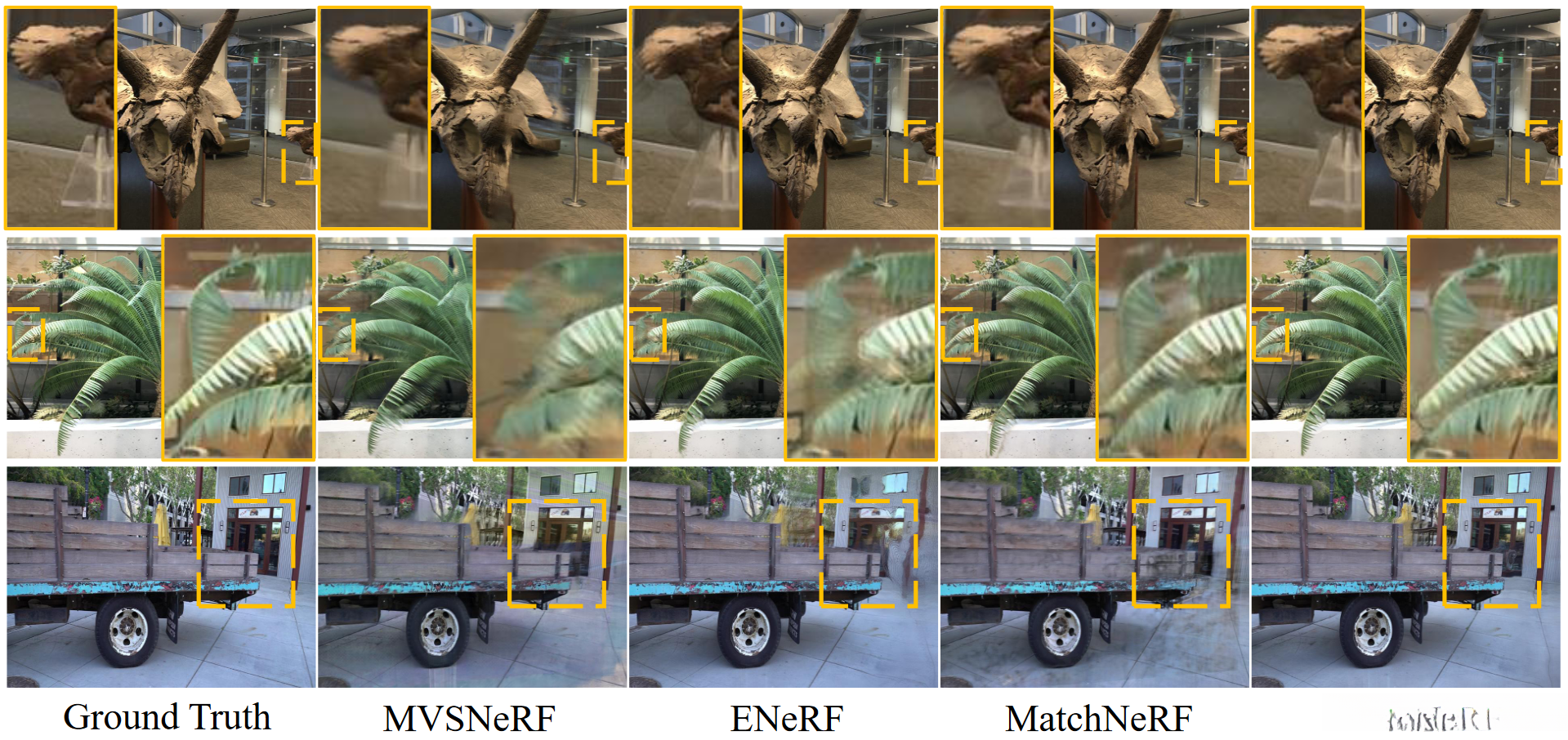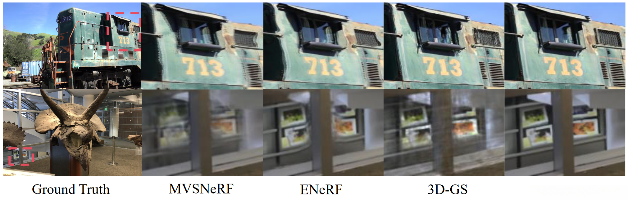 Qualitative comparison of rendering quality with state-of-the-art methods under generalization and three views settings.