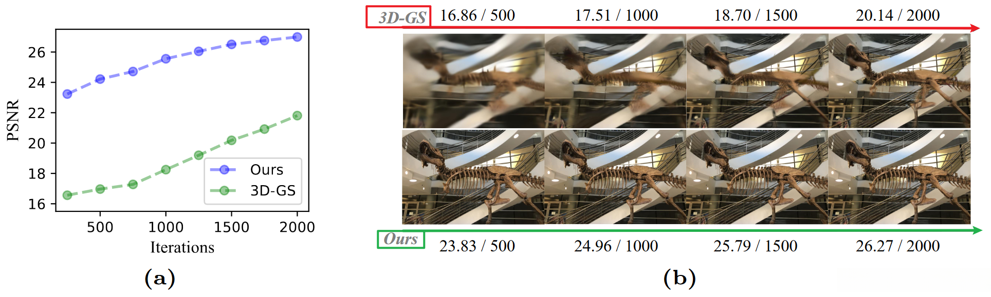 (a) The evolution of view quality (PSNR) on the Real Forward-facing dataset during thefirst 2000 iterations of our method and 3DGS.