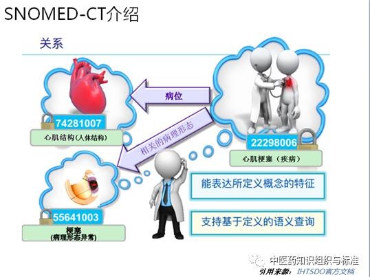 心肌梗塞属于一种疾病其部位位于心脏(人体结构类概念)属于某种形态特征的是其病理形态(病理形态类异常概念)。这种表达方式解决了对这类概念特征的表现问题并能促进语义信息的查询。