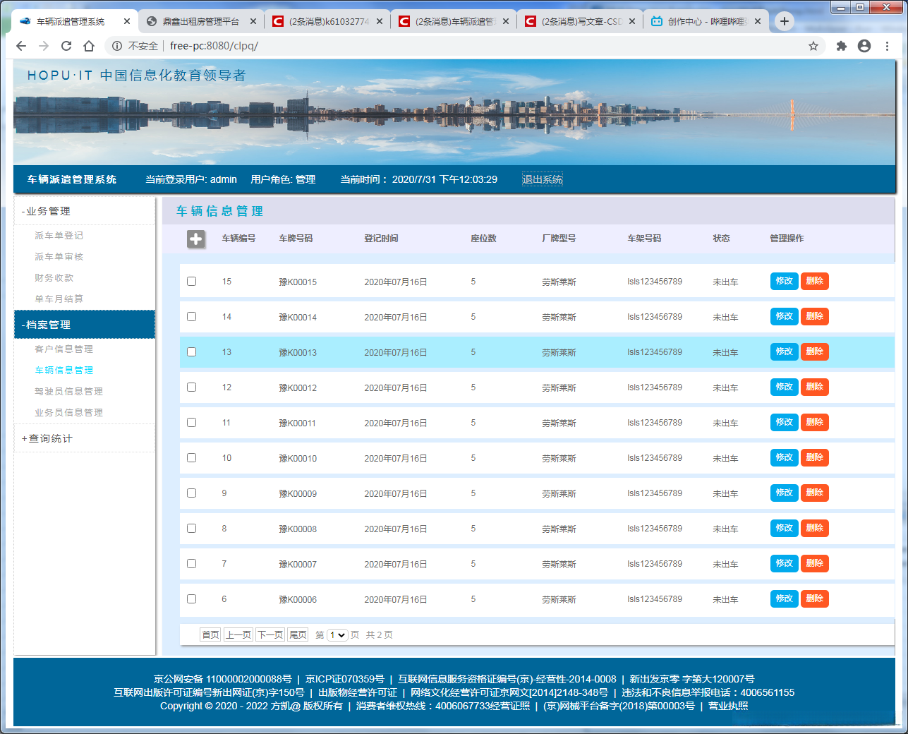 管理员登录以后可对车辆信息进行管理,在登录界面中找到档案管理模块并打开车辆信息管理选项,在右侧内容区加载对应车辆信息列表,并通过AJAX技术实时加载所有相关资料。
