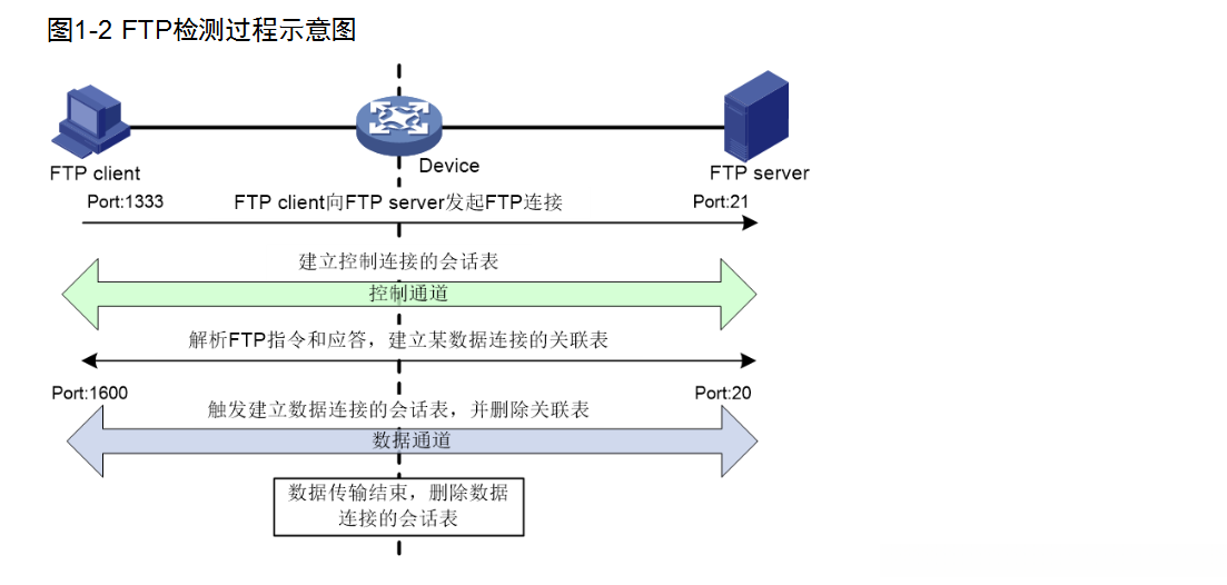 当FTP数据连接报文经过设备时,将导致创建会话表项用于建立数据连接,并删除与之相关的相关表项。
