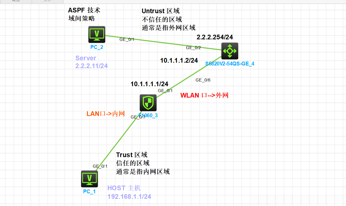 如果设备实现了对内网和外网的互联,并基于ASPF技术对内网上的主机及服务器进行防护配置,则该类内网上的端口就被统称为内网口,在外网上的相关端口则统称为外网口