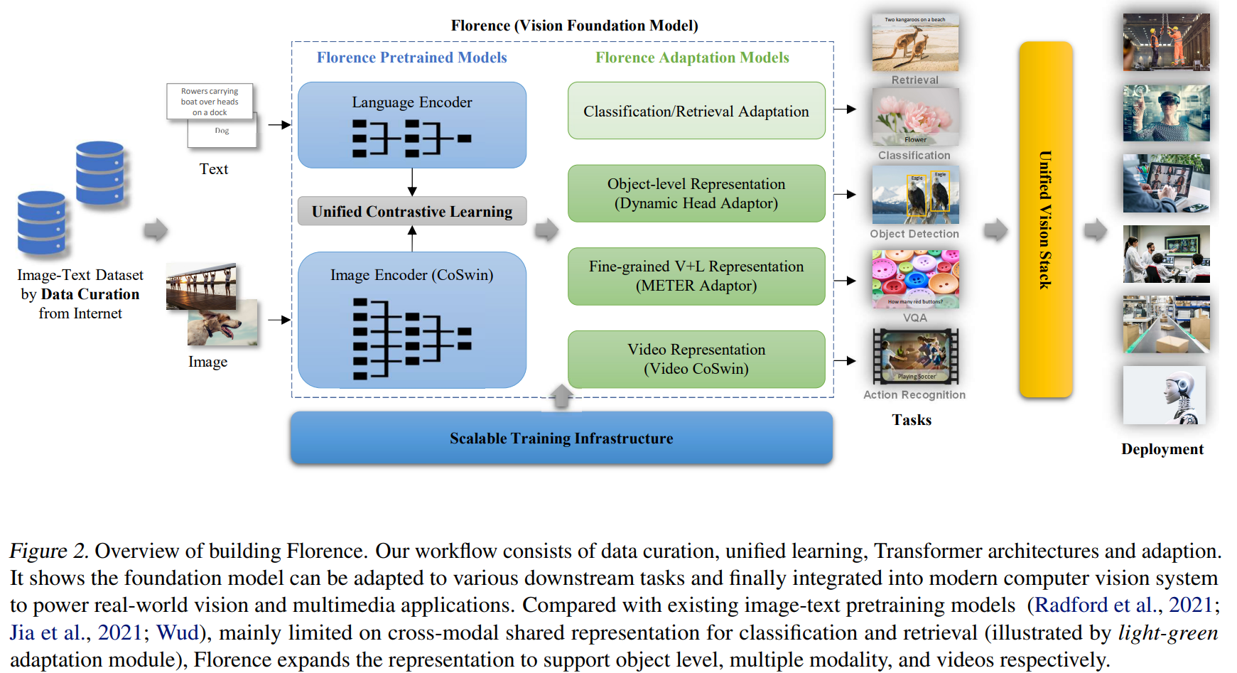 通过融合图像与文本数据的多模态视觉表示模型,Florence展现出卓越的迁移性能,并广泛适应于多种计算机视觉任务,包括分类任务,目标检测与跟踪技术以及语音问答系统等。