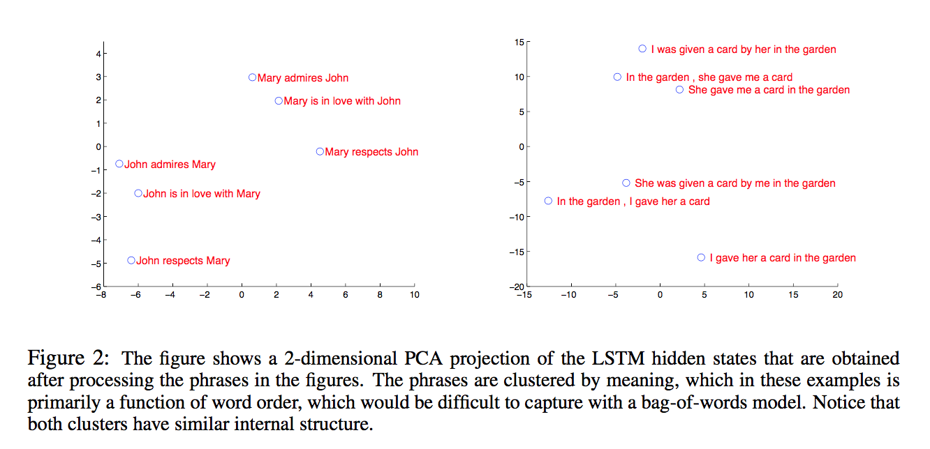 (1) 首先了对比了前人的工作,最早应用这种encoder来map输入的是使用的CNN,但这种方式忽略的sequence order,导致效果并不是很好;也有人用STM(统计机器翻译)进行学习的,但他们的工作重点是放在STM系统上,并不是神经网络的模型上。本文的这种encoder方法有什么优点呢?这种方法对主动语态和被动语态的包容性很好,也就是说,同一个句子的主被动语态通过encoder得到的向量是欧氏距离很近的,通过PCA降维到2维空间进行可视化如下图所示: