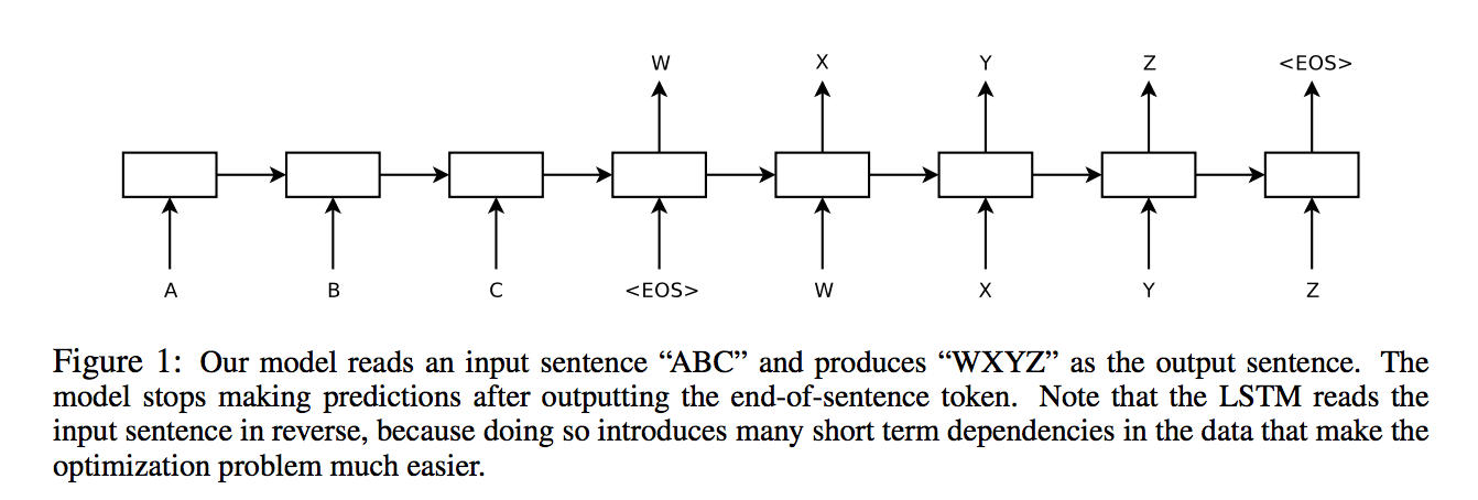 (3)什么是reverse input?分别输入a,b,c,d/d,c,b,a,通过encoder映射成一个fixed vector,但对应的decoder标签都是A,B,C,D,如此训练效果更好。文中解释道,这样的话a与A的距离会更近,对长序列的记忆效果更好,但d与D会更远,这个坏的影响却没那么大。综合来看解决了“minimal time lag”的问题,但具体为什么文中也没说清楚。