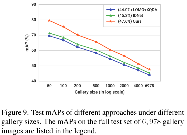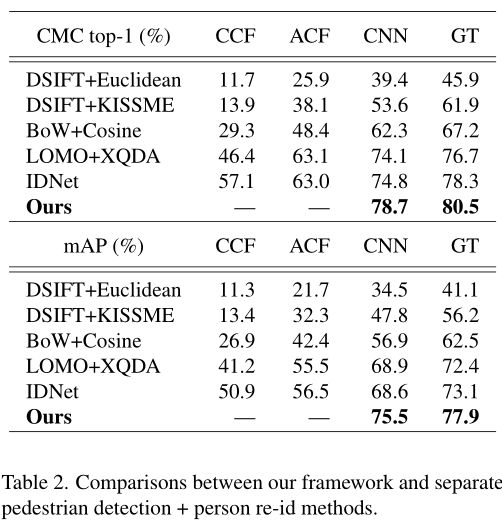 3.评价机制:采用了 CMC 的 top-K 和 mAP 评估指标。CMC 用于验证匹配的存在,在 top-K 个预测边界框中至少存在一个与 ground truths 匹配的框,并且其交并比(IoU)需达到或超过 0.5。而 mAP 则遵循了ILSVRC的目标检测标准。