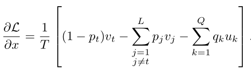 2.文中未采用SGD进行优化,而是采用了在线近似方法。在一个 mini-batch 中,每个 labeled identity 的特征表示被标记为 x(其中 x 是 D 维特征向量)。为此,我们建立了一个 LUT 来存储所有 labeled identities 的特征信息(该 LUT 为 D×L 维矩阵,其中 L 表示不同目标行人的数量)。在前向计算过程中,我们计算当前 mini-batch 中每个样本与其对应的 labeled identities 之间的余弦相似度(通过将 V 转置后乘以 x 实现)。在反向传播阶段,假设目标行人的分类标签为 t,则可以根据以下公式更新 LUT 中对应的目标行人的权重信息: