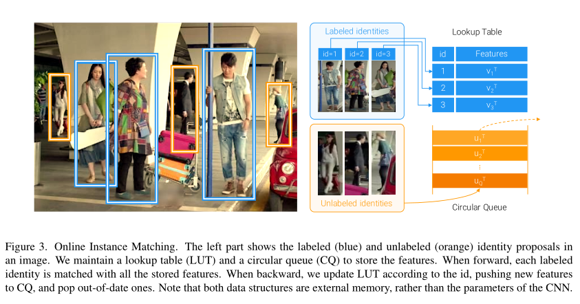 该方法在计算开销上存在较大规模的需求,并且 Softmax 损失函数在类别数量增加时会导致运行时间显著延长甚至无法收敛。因此我们提出了 Online Instance Matching 损失函数(OM-Loss)。该方法通过构建一个 lookup table 来整合所有带标签身份的特征信息,并与 mini-batch 样本之间的距离进行比较;同时那些未被标注的身份可被视为 negative samples,并将其特征存储在一个循环队列(circular queue)中进行对比。