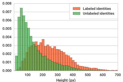 本文采用了两种数据集作为研究基础。其中一类是通过在城市环境中拍摄的照片获取的数据样本;另一类则源自于电影画面中的行人截图。这种分类处理有助于拓展研究场景的多样性。此外,在不同像素级别上进行了labeled与unlabeled身份信息的统计分析,并具体统计结果如下所示:
