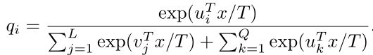 在该模型中,T调节了概率分布的平滑程度。类似地,在循环队列中,x被视作第i类无标记身份的概率为: