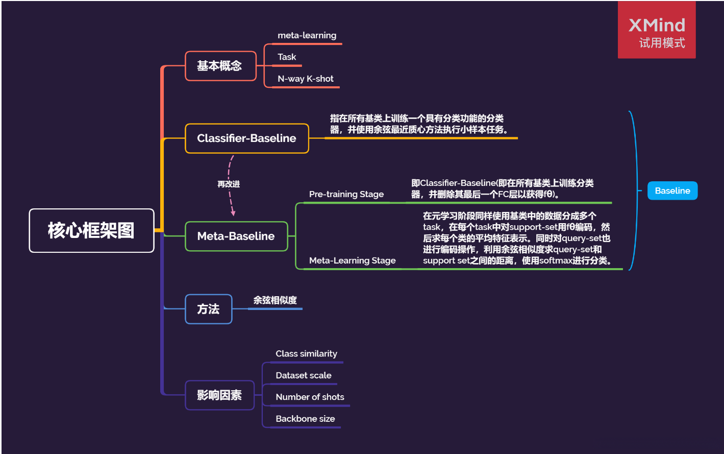 我们开发了一种简洁有效的单镜头学习方案,并命名为Meta-Baseline。该方案在性能上显著超越了当前最先进的方法,并在小样本分类领域奠定了新的基准水平。尽管近年来提出了多种元学习方法,并有若干研究者认为单一预训练分类器足以应对小样本学习任务;然而我们的Meta-Baseline则展现出双重优势:首先具备预训练能力;其次包含元学习特性;研究表明,在实现强大的性能方面这两点缺一不可:具体而言,在预训练阶段积累良好的少量样本分类度量对于提升模型泛化能力至关重要;这不仅有助于提高模型对已有知识的学习效率;更能增强其类间迁移能力