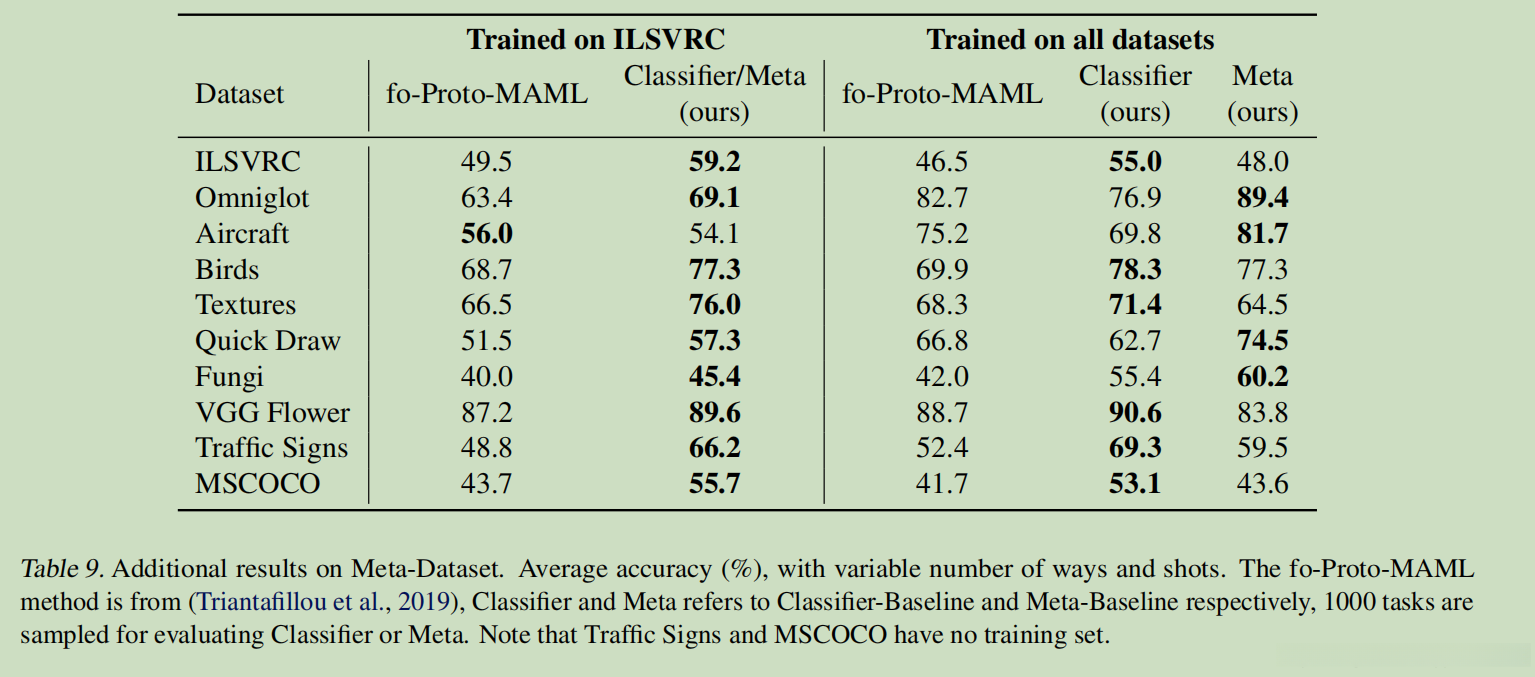 表9左侧专有地展示了仅在ILSVRC-2012中使用的数据集所训练的模型。我们观察到,在这种情况下,默认分类器基线超越了先前的方法。实验结果表明,在这种设置下,Meta-Baseline未超越分类器基线可能是因为较高的平均样本数量导致了这一现象