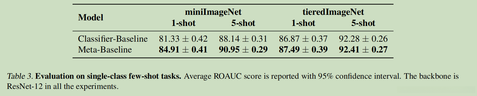 为了进一步证实这些改进不仅源于对N-wayK-shot任务的专业化, 我们构建了一个单类K-shot子任务, 用于对比评估Classifier-Baseline与Meta-Baseline的表现差异。 在该子任务中, 支持集由类c的K个样例构成, 而查询集则包含了类c与c0的两个不同类别各提供K个样例, 我们将AUC(基于ROC曲线计算的面积)分数作为查询样本二元分类性能的重要指标进行评估。 见表3中的结果, 研究发现元学习阶段的表现依然优于传统方法, 这表明元学习策略在处理小样本数据方面具有有效性
