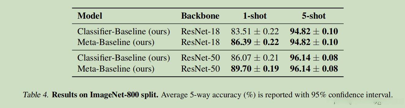 Meta-Baseline在miniImageNet、tieredImageNet和Image Net-800等基准数据集上显著优于现有方法。