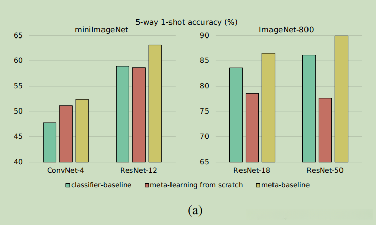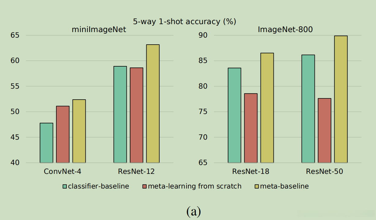 在图1a中发现,在使用基准分类器(classifier-baseline)时表现优于自监督学习方法(meta-learning from scratch)。值得注意的是,在浅层主干网络ConvNet-4中该现象并不显著出现,并且基于深度骨架的ResNet可能对方法性能产生影响。
