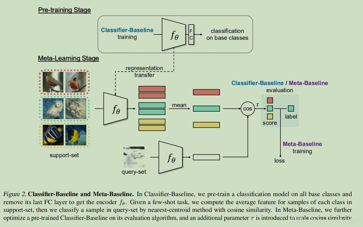 图2展示了两种分类器设计:基线型和改进型Meta-基线架构。在传统的Classifier-Baseline设置中,我们首先建立一个预训练分类模型,并通过去除其最后一个全连接层(FC层)来提取编码器fθ。接着,在面对小样本学习任务时,我们计算了支持集中各类别样本的平均特征向量,并采用基于余弦相似度的质心分类策略对查询集中的测试样本进行识别。而在改进型Meta-Baseline架构中,则进一步采用了图像化的方法对预先训练的基础分类器进行了优化,并引入了一个缩放因子τ以调节余弦相似度计算过程中的权重分配。