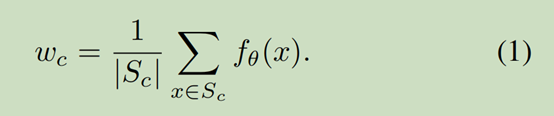 分类器-基线基于所有基类进行训练,并采用余弦最近质心方法处理小样本任务。具体而言,在所有具备标准交叉熵损失的基类上经过训练后获得一个分类器模型,在去除其最后一个全连接层(FC)后得到编码器fθ(theta),该编码器将输入数据映射至特征空间中。对于一个小样本任务来说,在支持集S中选取c类的小样本数据集Sc时(即假设Sc代表c类的小样本),我们可以计算出每个类别对应的平均特征向量W_c作为其质心:即通过计算每个类别支持样例的平均特征值来确定该类别质心的位置。