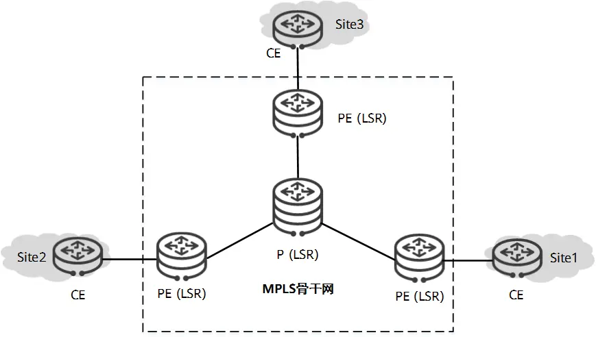 MPLS VPN的基本模型主要由以下三种角色构成: