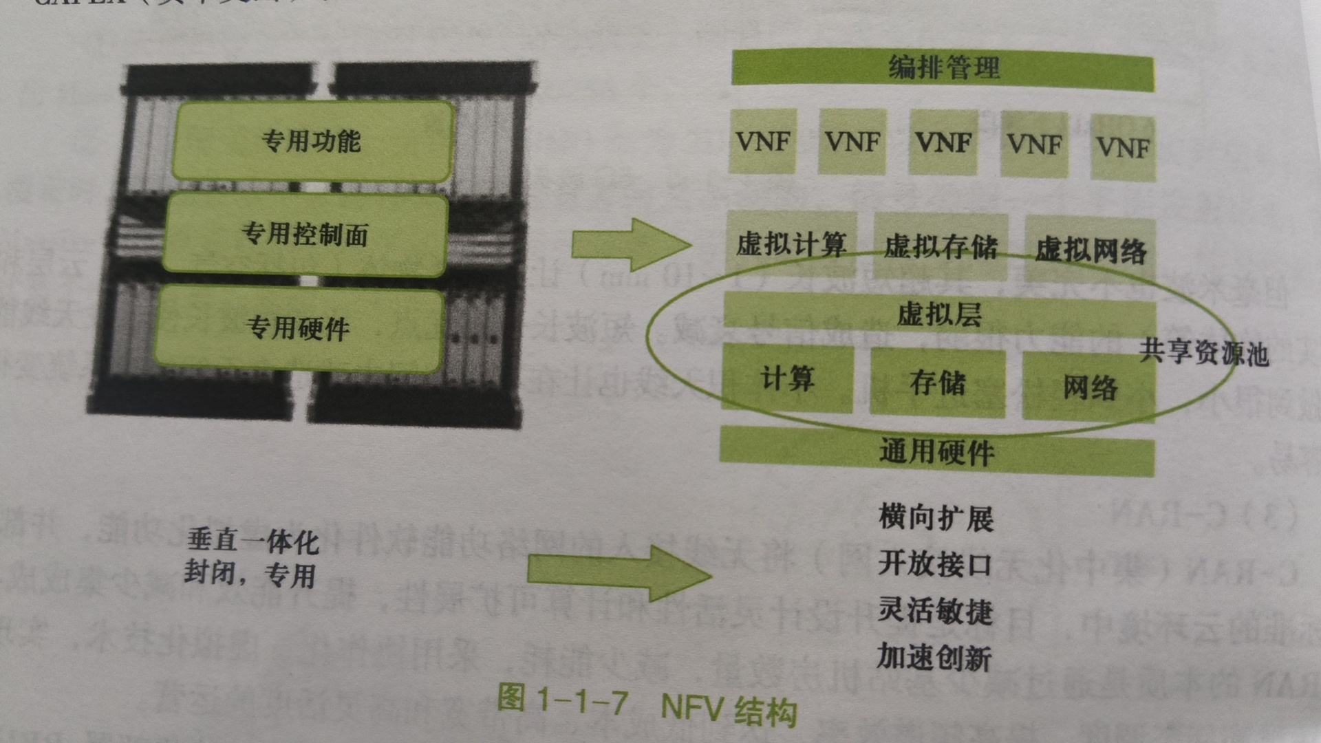 NFV是采用IT虚拟化技术将网络功能软件化并在通用硬件平台上运行从而取代传统的专用网络硬件设施如图1-1-7所示 NFV则通过将网络功能部署到虚拟机上实现对通用硬件或透明容器的支持这不仅提升了配置的灵活性可扩展性和移动性同时也降低了项目的资本支出(CAPEX)和运营成本(OPEX)。