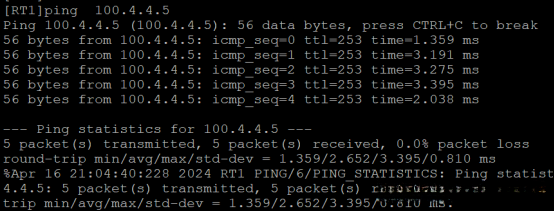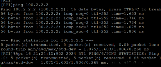 [RT1]%Apr 16 21:57:56:919 2024 RT1 PING/6/PING_STATISTICS: Ping statistics for 100.2.2.2: 5 packet(s) transmitted, 0 packet(s) received, 100.0% packet loss.