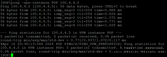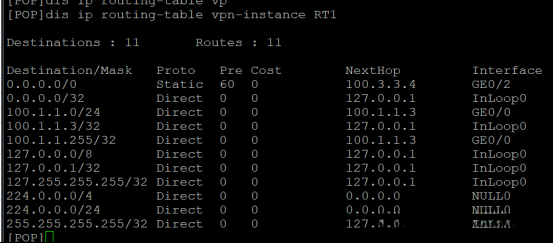 [POP]ip route-static vpn-instance POP 100.1.1.0 24 vpn-instance RT1 100.1.1.1