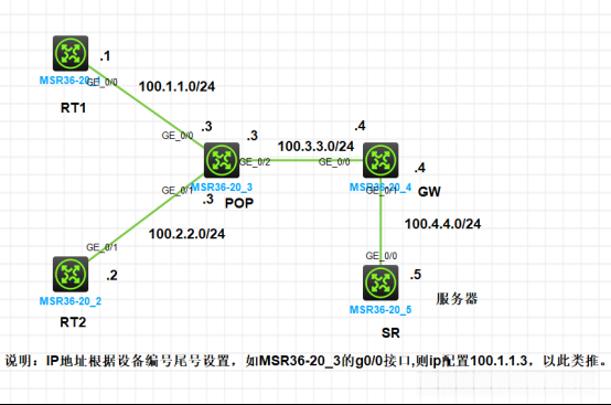 RT1-RT2分别对应2个内网网关,用户流量在POP设备上通过VRF进行隔离,同时需要经过GW设备访问SR服务器