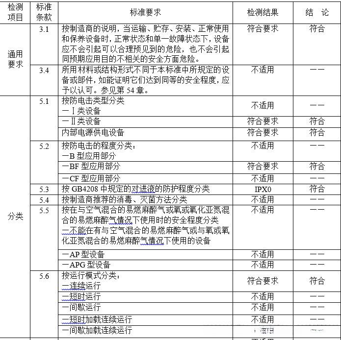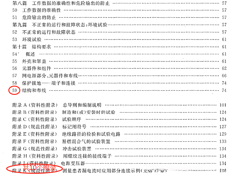 GB9706.1中详细的规定了适用于各种医用电气设备的安全要求, 标准全篇包括概述、环境条件、对电击危险的防护、对机械危险的防护、对不需要的或过量的辐射危险的防护、对易燃麻醉混合气点燃危险的防护、对超温和其他安全方面危险的防护、工作数据准确性和危险输出的防止、不正常运行和故障状态以及结构要求等十篇。