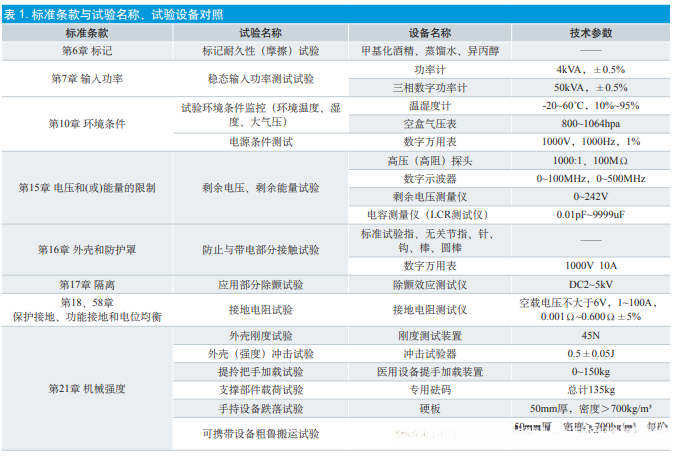 但试验项目涵盖在 59 个章节、11 个 附录、16 张表、51 张图中相对抽象,文字枯燥,而且并未具体给出大多数试验项目所需的测试工具。对于研究和学习 GB9706.1 标准造成了一定的不便。