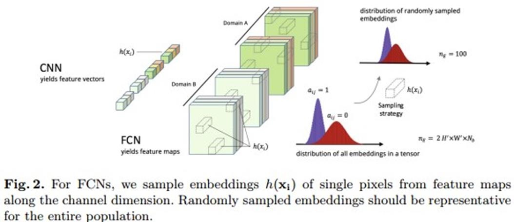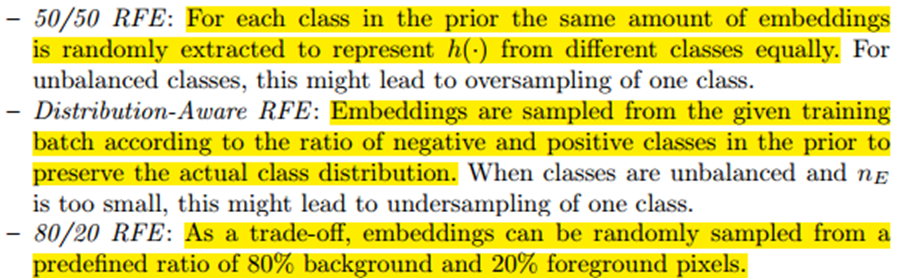 随机特征嵌入(RFE): 基于某种在下一节将讨论的采样方法,在当前批次中限定数目地选取nE个像素来自其特征图中。该损失能够维持其有效性, 因为我们仅传播所选像素对应的梯度信息.