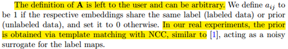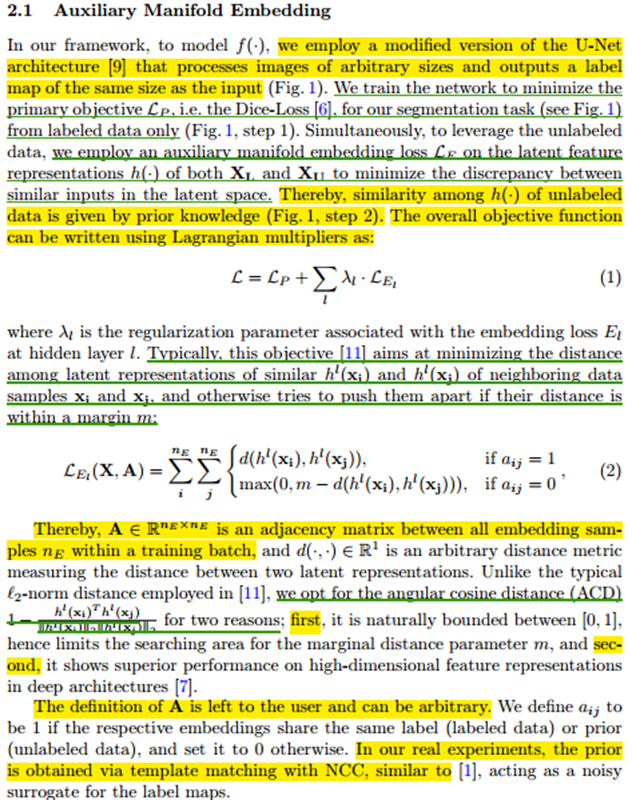 本文指出了两个损失项的具体定义:Lp用于表征有标签数据(Dice-loss),而LE则用于表征无标签数据(auxiliary manifold embedding loss);其中LE基于有标签与无标签数据共同提取出的关键信息特征表示h(.)这一框架,并旨在最小化潜在特征空间中相似输入之间的差异