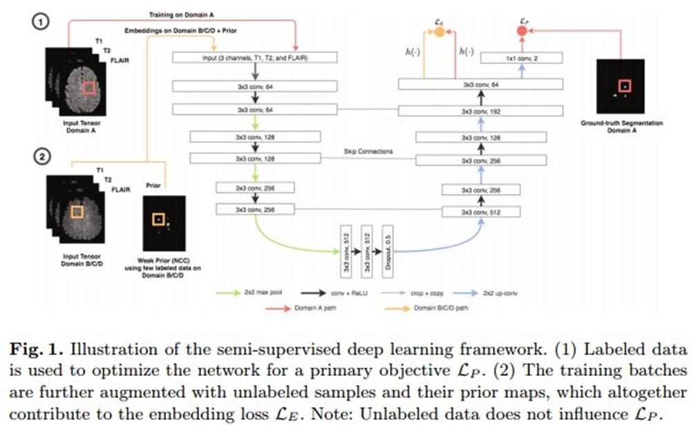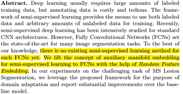 目前对于FCN分割领域仍缺乏有效的半监督学习方法。本研究引入了辅助流形嵌入概念,在随机特征辅助框架下成功应用于FCN的半监督学习任务中,并通过现有方法对现有MS lesion分割任务进行了系统性实验验证。
