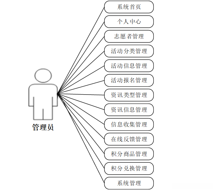 本系统分为管理员和志愿者两大模块,管理员的权利是最大的,可以对系统所有功能进行管理;其次是志愿者;用例分别如下所示: