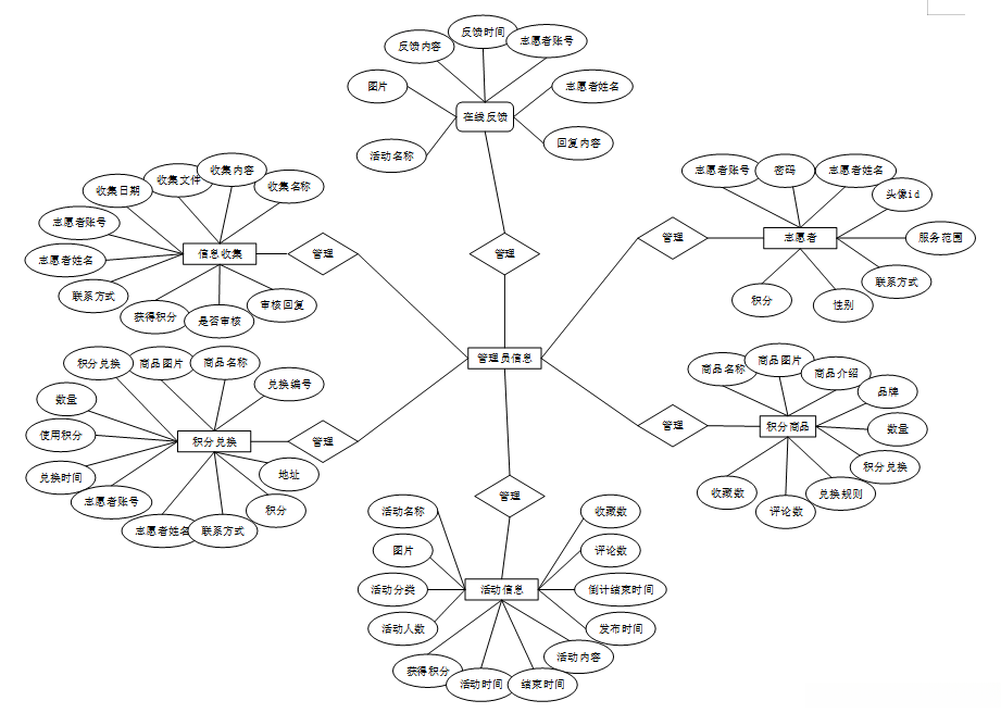 本社区空巢老人互助养老app的E-R图描述了在系统中各个实体之间的联系,将“在线反馈、信息收集、积分商品、积分兑换、活动信息、志愿者”等作为实体,它们的局部E-R图,如图4-4所示: