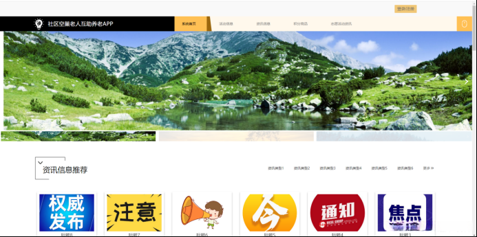 当人们打开系统的网址后,首先看到的就是首页界面。在这里,人们能够看到社区空巢老人互助养老APP的导航条,通过导航条导航进入各功能展示页面进行操作。系统首页界面如图5-6所示: