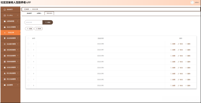 活动分类管理;在活动分类管理页面输入活动分类进行查询、创建或删减活动分类列表,并根据需要对活动分类详细信息进行查看、修改或删除操作;如图5-12所示。