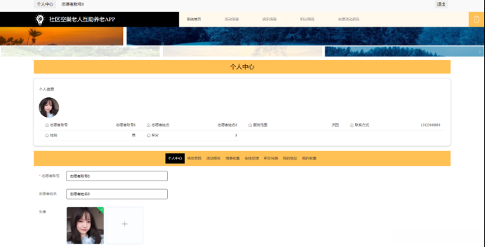 志愿者模块的主要设计是:在登陆成功后,本系统实现对个人中心、修改密码、活动报名、信息收集、在线反馈、积分兑换、我的地址、我的收藏等功能进行详细操作;