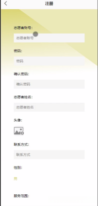 第一次使用本app的使用者,首先是要进行注册,点击“注册”,然后就会进入到注册的页面里面,将志愿者信息录入注册表,确认信息正确后,系统才会进入登录界面,志愿者登录成功后可使用本app所提供的所有功能。注册界面如图5-2所示。