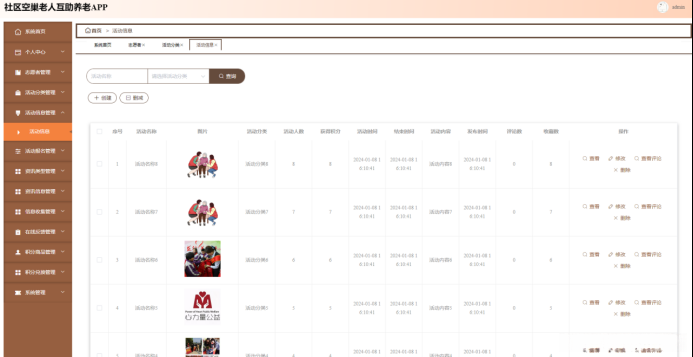 活动信息管理;在活动信息管理页面输入活动名称和选择活动分类进行查询、创建或删减活动信息列表,并根据需要对活动信息详细信息进行查看、修改、查看评论或删除操作;如图5-13所示。