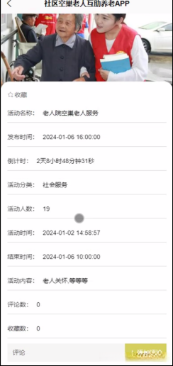 活动信息:在活动信息界面可以查看到活动名称、发布时间、倒计时、活动分类、活动人数、活动时间、结束时间、活动内容、评论数、收藏数详细信息,并根据需要进行评论或收藏操作。活动信息详情如图5-4所示。