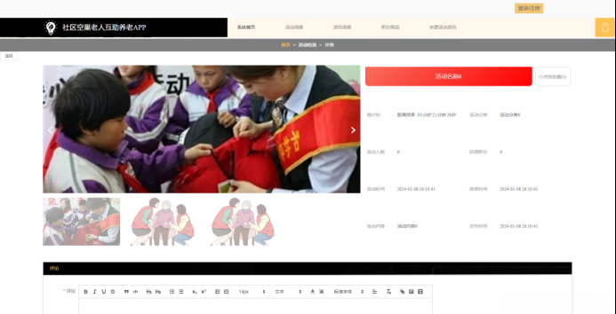 社区活动组织 :社区工作人员可以通过平台发布活动信息,老人可以报名参加。