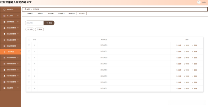 资讯类型管理;在资讯类型管理页面输入资讯类型进行查询、创建或删减资讯类型列表,并根据需要对资讯类型详细信息进行查看、修改或删除操作;如图5-15所示。