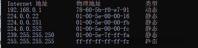 我们的电脑自身也配备了独立的ARP缓存表,在能够通过控制台界面中运行"arp -a"命令来获取相关信息的具体位置上可以看到相关的配置信息。通过图中的截图部分可以看到这些配置的具体设置情况。