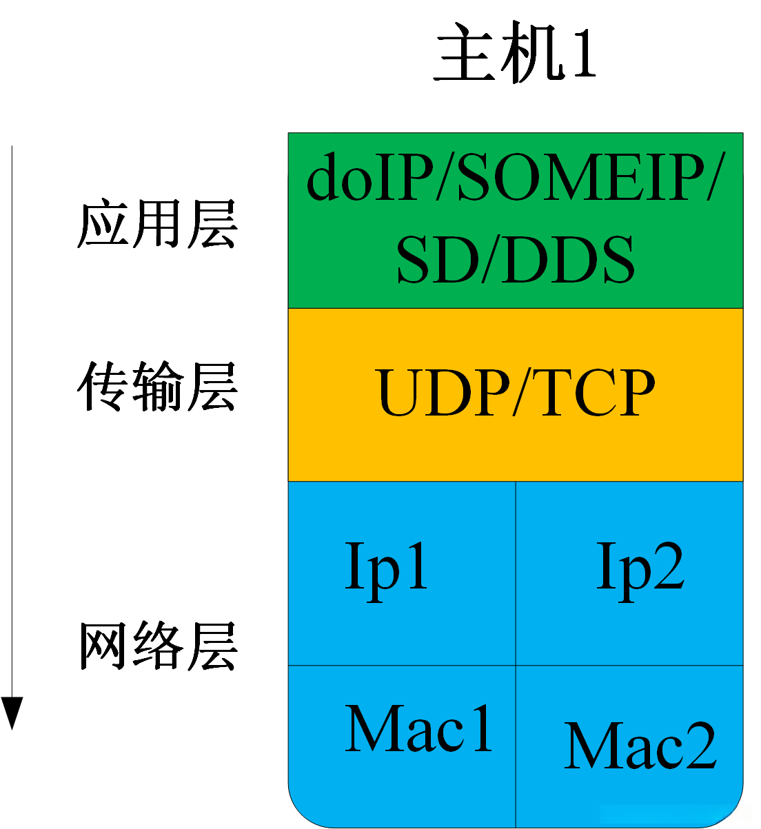 在附图中,请注意将DoIP、SOMIP、SD和DDS等典型上层协议进行封装;将UDP和TCP协议进行中继连接;最后将IP与MAC地址分别进行封装。