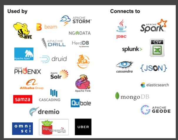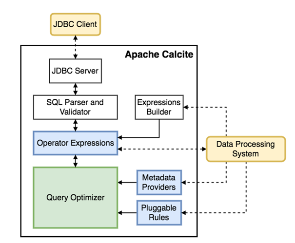 该图表采用了Apache Calcite开源数据处理系统,并且该系统能够连接到可用的数据源。
