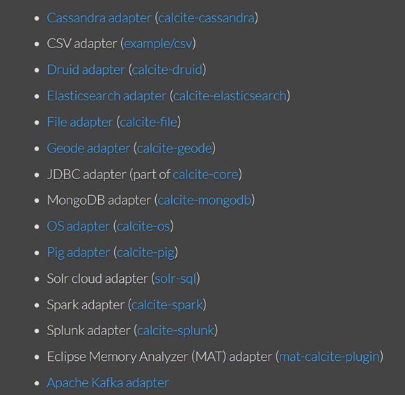 该系统已集成多种功能完善的适配组件,并非仅限于此。同时我们也具备构建新模块的能力。如图所示为Calcite内置的适配组件列表。