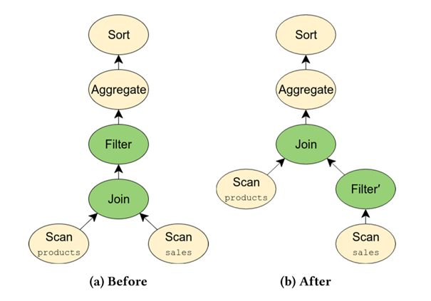 由于WHERE子句仅作用于sales表, 我们可以将filter移动至join之前(如图所示右边部分)。该优化将显著降低运行时间. 若这两张表不在同一个backend环境中, 则这一优化使适配器能够将filter下推至backend中. 这一规则即为Calcite中的FilterIntoJoinRule.