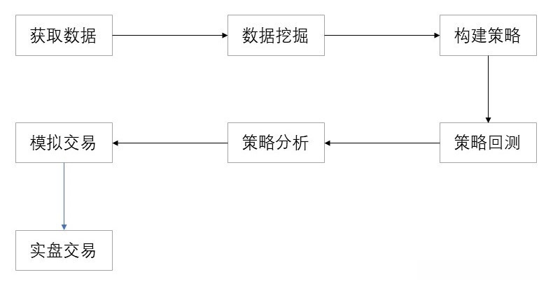 量化回测框架支持全面的数据系统,并采用回测机制对策略实施评估研究;具备实时模拟交易能力,并以助于实盘交易方案的选择;流程 如下所示:
