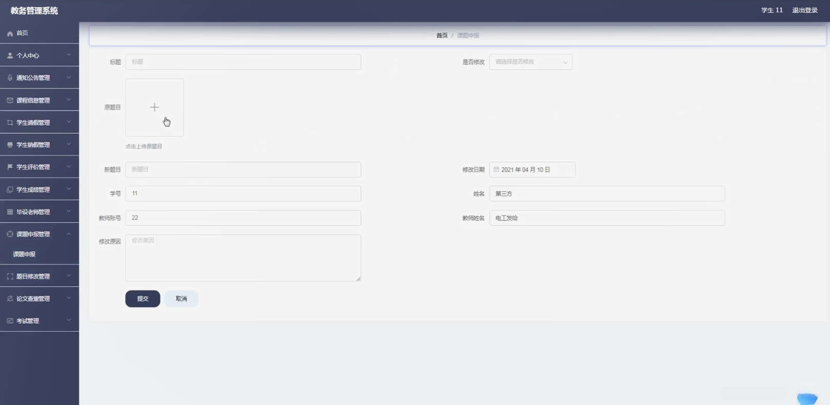 课题申报管理:本系统的功能负责对学生的课题申报信息进行统一管理和跟踪,并包含但不限于以下内容:学生基本信息、课题名称、申请时间等关键数据。