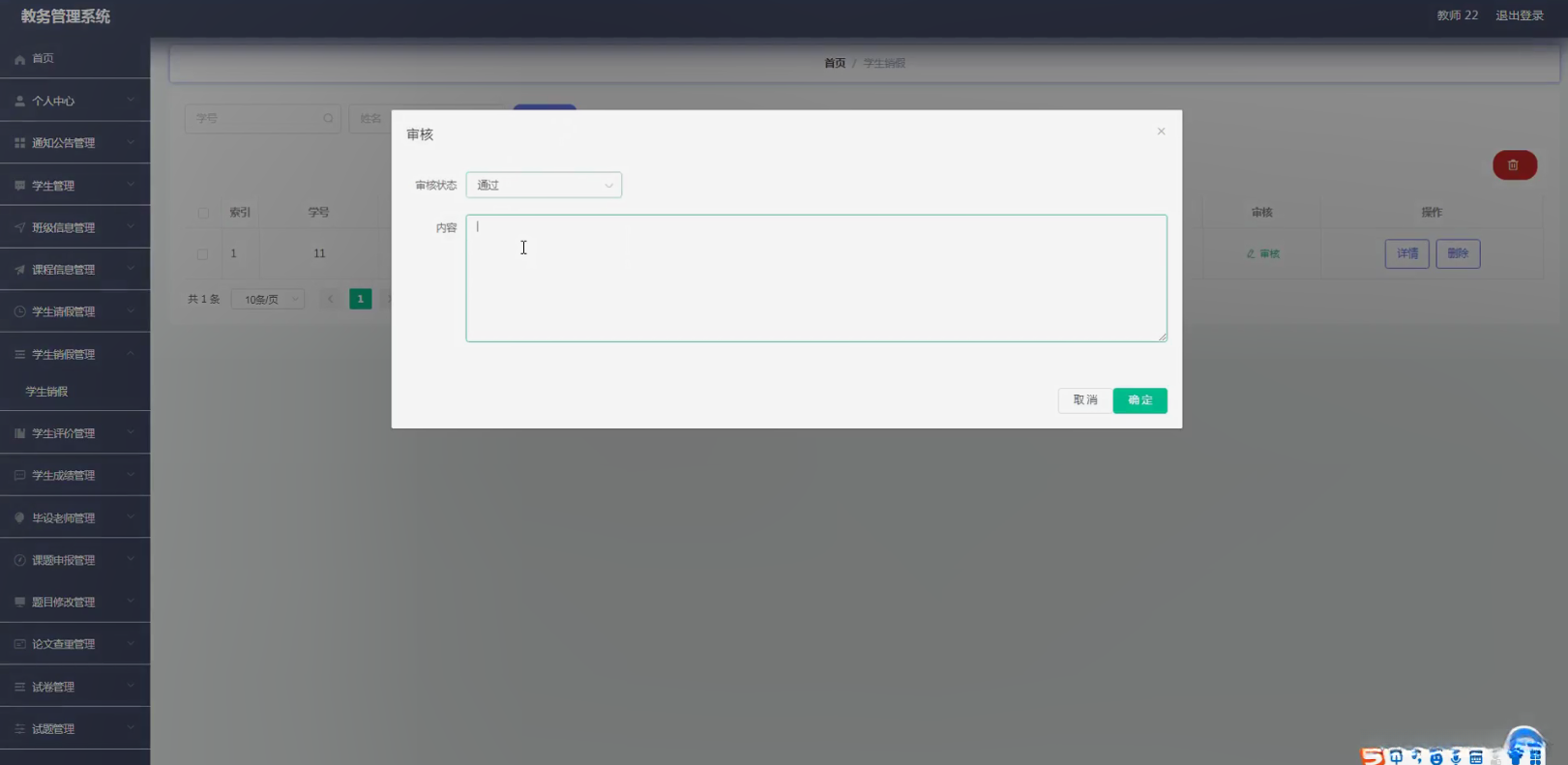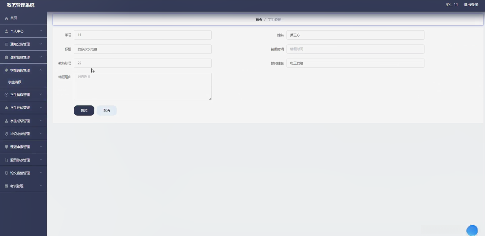 学生请销假操作:此功能旨在对学生的请销假流程进行规范化处理。涵盖的功能包括:学生提交请假申请、教师审批程序以及完成核销登记等关键环节。通过该系统模块的运行, 学校可实现对学生成请销假活动的有效监督与服务保障